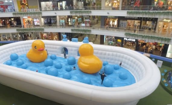 Customized inflatable bathtub filled with bubbles and giant rubber ducks were designed for enjoyment of families.