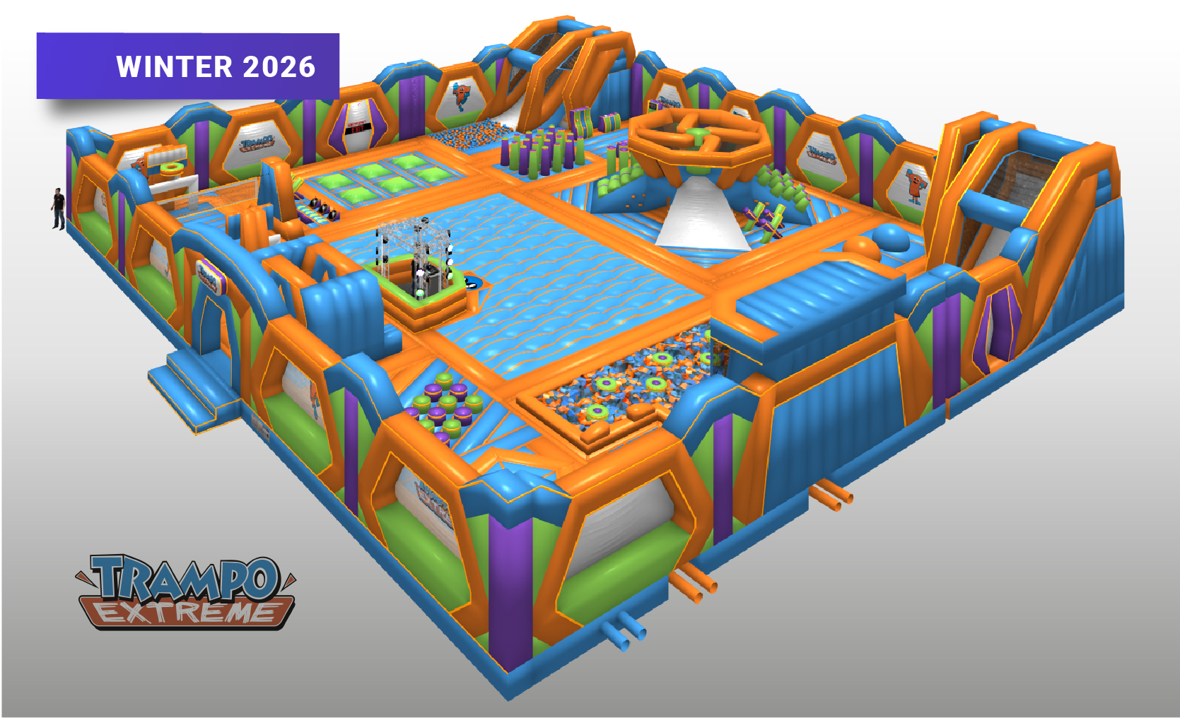 This inflatable park custom designed for the #1 trampoline park in Edmonton, AB featuring tons of attractions in a very compact footprint.